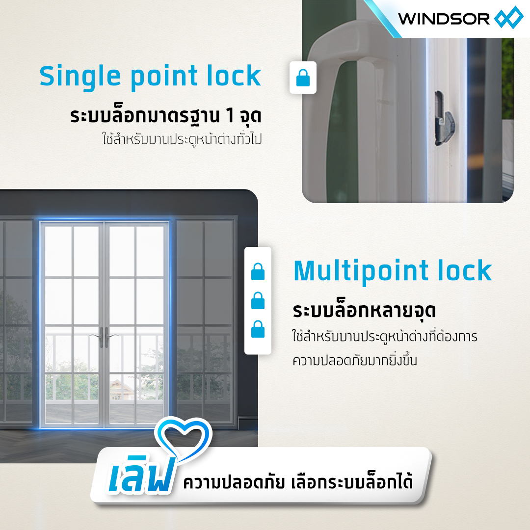 โดยปกติประตูหน้าต่างไวนิลวินด์เซอร์จะมีระบบล็อก Single point lock ซึ่งเป็นระบบล็อกจุดเดียวบริเวณมือจับ ที่เป็นมาตรฐานติดมาให้ทุกบานอยู่แล้ว