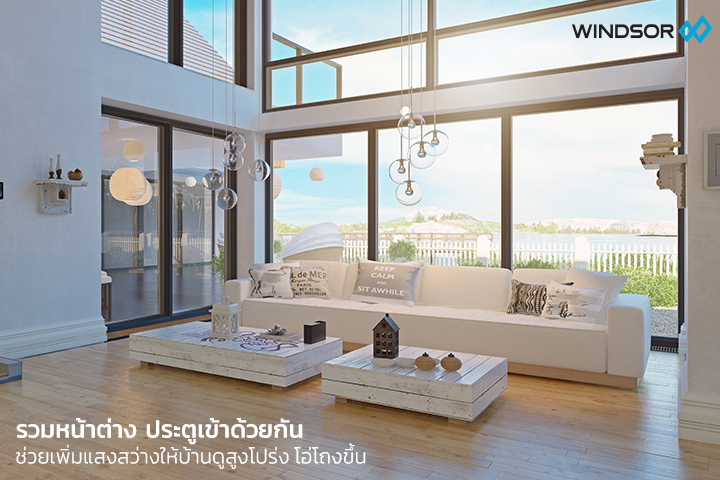 ปกติแล้วแทบทุกบ้านจะมีหน้าต่างและประตูใกล้ ๆ กัน แต่ไม่ได้รวมกันเป็นบานเดียวเพื่อเปลี่ยนหน้าต่างแคบ ๆ กับประตูทึบ ๆ ให้ดูสูงโปร่งขึ้น ซึ่งการรวมประตูหน้าต่างเข้าด้วยกันจะช่วยเพิ่มความโอ่โถงให้บ้าน และช่วยให้อากาศถ่ายเทเข้ามาในบ้านของคุณมากขึ้นอีกด้วย การแยกประตูและหน้าต่างเป็นคนละส่วนจะทำให้บ้านมีพื้นที่ผนังมากกว่าการรวมประตูและหน้าต่างเข้าด้วยกัน บ้านจึงดูทึบ และผนังยังเป็นศูนย์รวมดูดซับความร้อนมากกว่ากระจก ดังนั้น บ้านหลังไหนมีปัญหาเรื่องความอับชื้นและร้อนจัด อาจเปลี่ยนมาใช้วิธีรวมประตูและหน้าต่างเข้าด้วยกันเป็นบานใหญ่บานเดียวเพื่อลดปัญหานี้