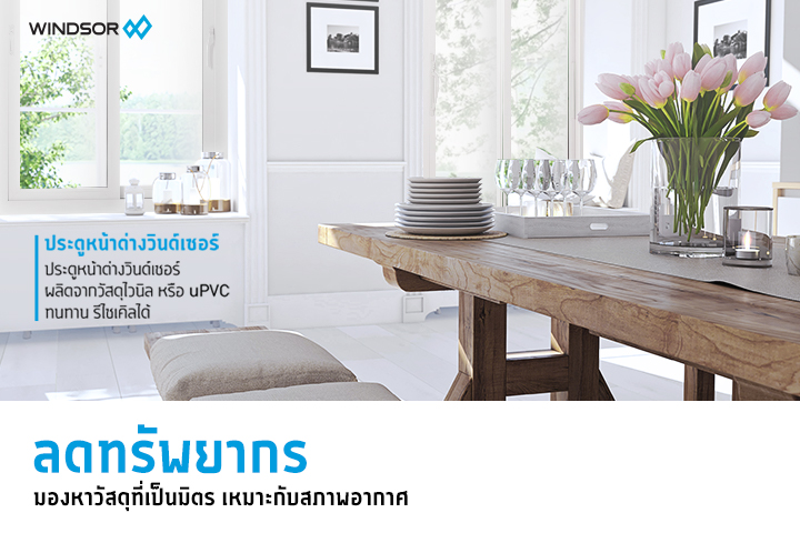 อีกหนึ่งทางที่เราสามารถช่วยดูแลโลกได้ คือการลดใช้ทรัพยากรที่ไม่จำเป็น และหันมาเลือกใช้วัสดุรักษ์โลก ซึ่งหากคุณกำลังจะติดตั้งประตูหน้าต่าง ก็ควรเลือกใช้กรอบบานที่ทำจากวัสดุไวนิล หรือ uPVC ของวินด์เซอร์ ซึ่งเป็นวัสดุที่ใช้พลังงานในการผลิตต่ำ สามารถนำไปรีไซเคิลได้ คงทนต่อสภาพแวดล้อม ทนทั้งแดด ทั้งฝน อายุการใช้งานยาวนาน เพราะออกแบบมาให้รองรับสภาพอากาศประเทศไทยโดยเฉพาะ